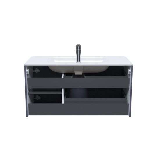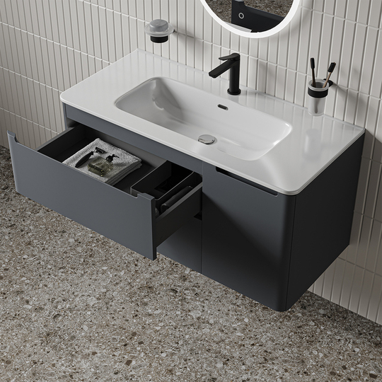 Два выдвижных ящика с механизмом плавного доведения, одна распашная дверца.