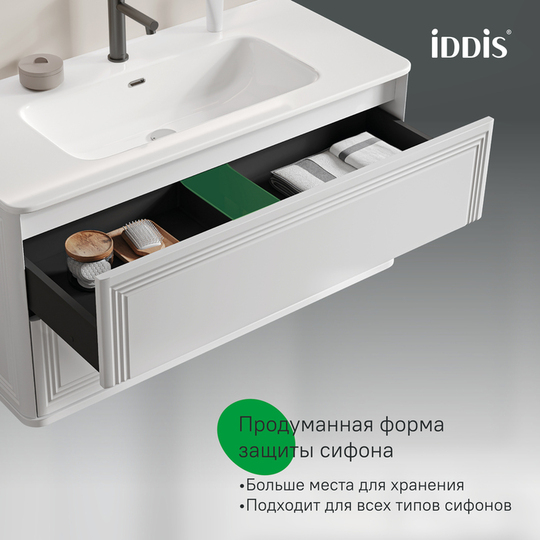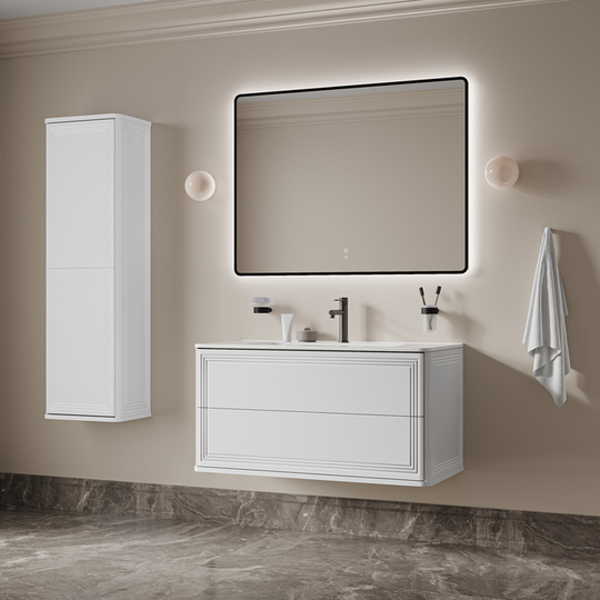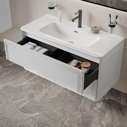 Вместительная подвесная тумба Oxford Neo с умывальником и выдвижными ящиками в элегантном стиле нео-классика с изящной фрезеровкой на фасадах и торцах. Идеально дополнит современные и классические интерьеры и станет настоящим украшением ванной. При желании тумбу можно сделать напольной – ножки высотой 30 см продаются отдельно в трёх цветах (белый, чёрный и светлый бук).